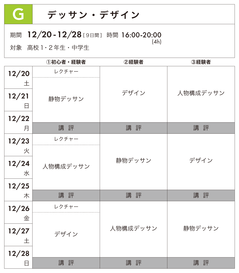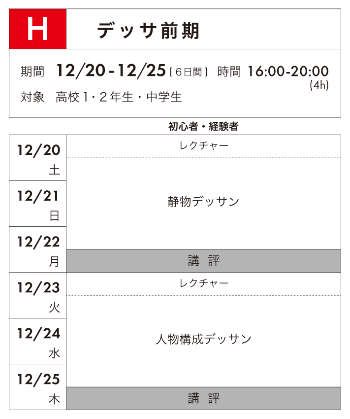 美術が好き、あるいは将来美術の世界で仕事をしていきたいと考えている高校1・2年生、中学生を対象としたコースです。基礎科として必要なデッサン力、色彩感覚、構成力等を養いながら、経験者はより完成度の高い作品制作を、初心者は楽しみながらものづくりを体験するよい機会です。