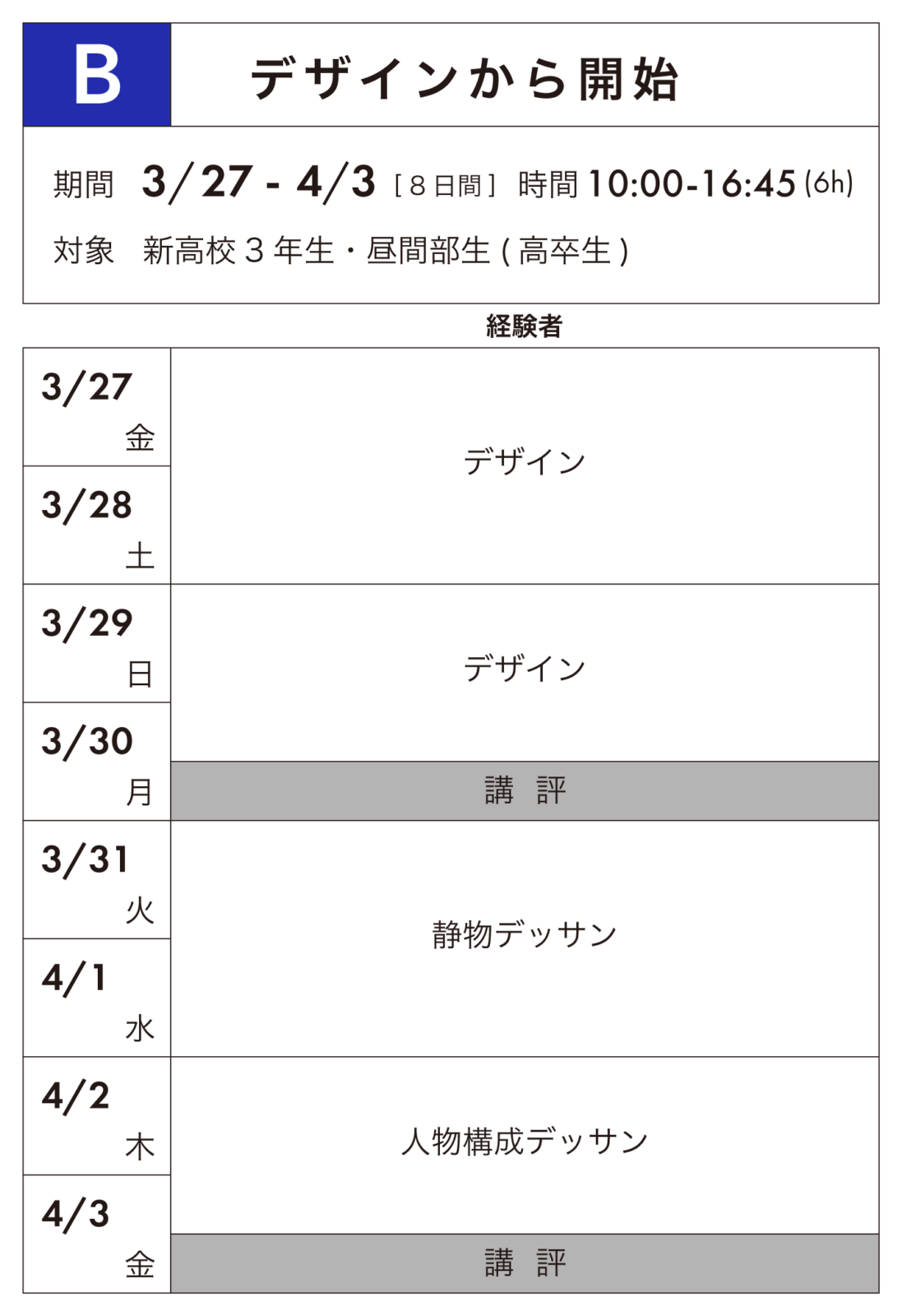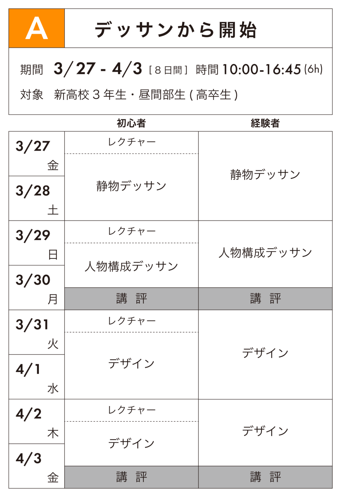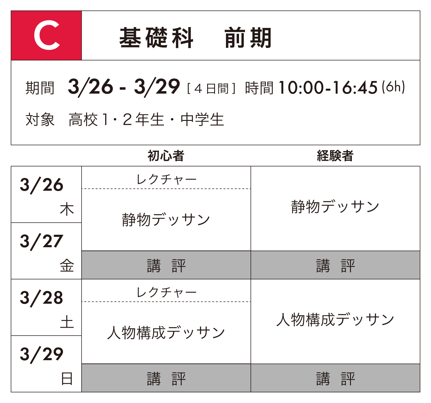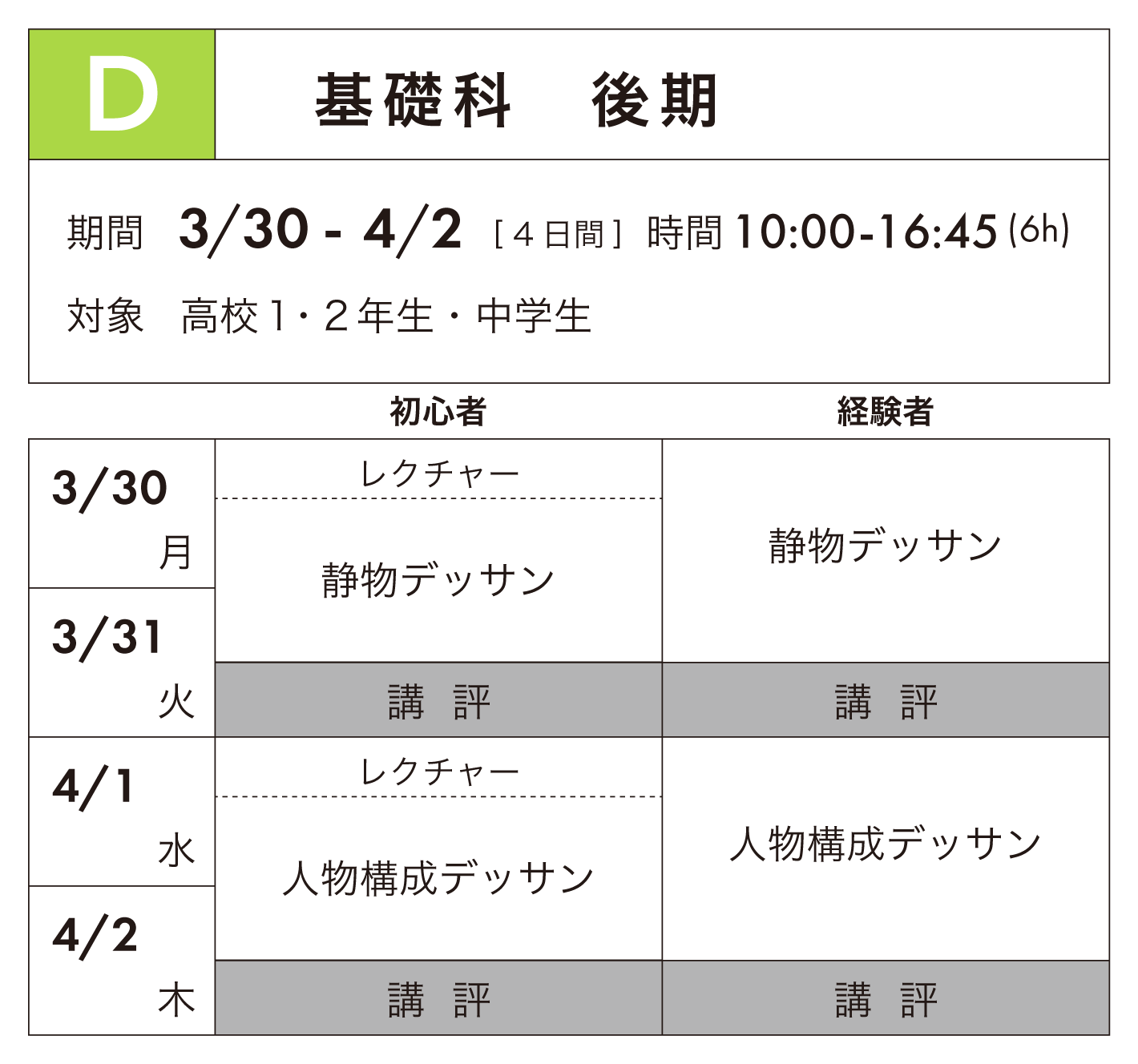 美術が好き、または将来美術やデザインの世界で仕事をしていきたいと考えている高校1・2年生、中学生を対象としたコースです。一人一人の経験に応じたきめ細かい指導をしていきます。前期・後期の内容は同じです。どちらかを選択してください。